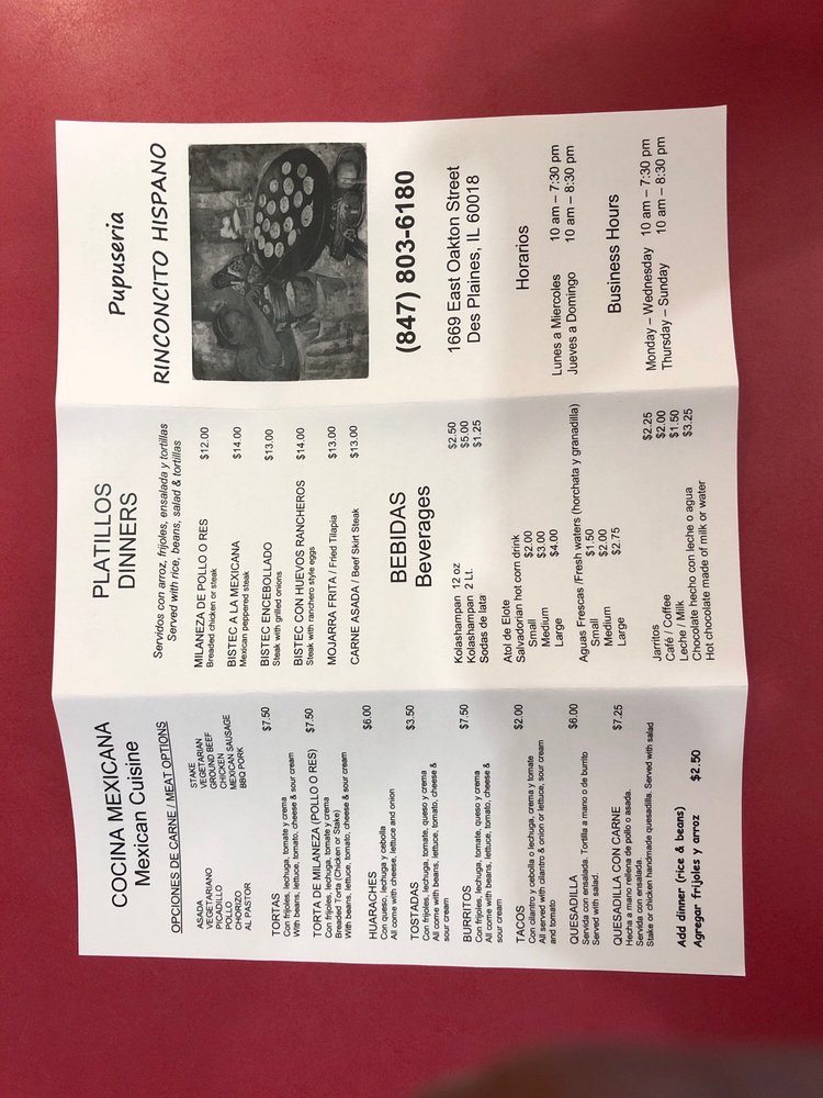 Welcome to Pupuseria Rinconcito Hispano, a hidden gem located at 1669 E Oakton St in Des Plaines, IL. This restaurant specializes in pupusas, a delightful staple of Salvadoran cuisine, made with masa and filled to perfection. The ambiance is warm and inviting, perfect for a casual meal or a family gathering.